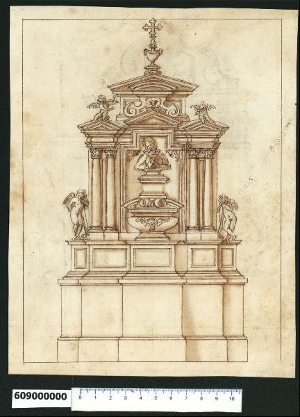 - NOTIZIE STORICO CRITICHE Nell'"Indice de due Tomi d'Intagli Tempietti ed altro", relativo ai tomi V e VI e compilato dal collezionista Giacomo Sardini, il disegno viene iscritto nel paragrafo "Mausolei sepolcrali" con la definizione "156 con solo busto".\nIl foglio in esame presenta il disegno di un monumento funebre a parete. Sopra la cornice sagomata dell'alto basamento inferiore, articolato su più piani verticali e che si eleva da una zoccolatura a pavimento, è posto un secondo basamento a riquadrature che ne segue l'andamento, con una soluzione differente nei pannelli laterali del secondo piano. Sulla parte centrale più avanzata è posto il sepolcro la cui base posta su un piedistallo ha una forma arrotondata decorata da una testa di cherubino. Sopra il coperchio di chiusura in forma di frontone a volute contrapposte al centro, si staglia il busto di una figura femminile in preghiera posta su un alto piedistallo sagomato. La figura è circondata in secondo piano da una cornice dal profilo superiore rialzato al centro per inquadrarne la testa, mentre agli angoli interni sono poste due testine di cherubino. Ai lati della cornice si trovano due coppie di colonne con basi distinte che sorreggono tramite cornici sagomate due piccoli frontoni triangolari inglobati in altri due frontoni e sovrastati da angioletti. Altri due angeli con le \nfiaccole rovesciate (sul significato, cfr. Milano, Collezione Sardini Martinelli inv. 6,30) sono collocati all'esterno della composizione sul basamento in terzo piano più prossimo alla parete.\nLa cornice centrale è pure sormontata da un frontone triangolare leggermente più ampio e rialzato dei laterali e su di esso poggia un mascherone da cui si dipartono due volute laterali. Questo elemento si staglia sullo sfondo di un corpo rettangolare riquadrato ed è sovrastato da un frontone curvilineo inglobato nel frontone triangolare superiore, sopra il quale è posta un'urna con croce trilobata su piedistallo. La composizione superiore ha quindi una struttura tripartita, che, insieme all'innalzamento centrale della cornice sopra l'altare per l'inserimento della figura e all'introduzione di frontoni uno nell'altro, costituisce una caratteristica tipica delle opere di Montano.\nIl disegno, attribuito a Giovanni Battista Montano da V. Pracchi su segnalazione di A. Bedon (Pracchi, 1991 p. 20) e da L. Fairbairn (Fairbairn, 1998 vol. II, Appendix 8, p. 771), è incorniciato da una marginatura semplice. \nNon si ha certezza che l'esecutore del disegno sia Montano o un lavorante della sua bottega.