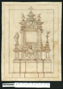 - NOTIZIE STORICO CRITICHE Nell'"Indice de due Tomi d'Intagli Tempietti ed altro", relativo ai tomi V e VI e compilato dal collezionista Giacomo Sardini, il disegno viene iscritto nel paragrafo "Mausolei sepolcrali" con la definizione "157 senza colonne in due maniere".\nIl disegno di cenotafio raffigurato sul foglio in esame presenta due versioni compositive rispetto alla mezzeria. La parte centrale avanzata dell'alto basamento, elevato sulla zoccolatura a pavimento, reca nella parte superiore un elemento curvilineo sagomato in due volute terminali, che costituisce il piedistallo per il busto con l'effige del defunto. Quest'ultimo è incorniciato dal rialzo in forma semicircolare del bordo inferiore della cornice sagomata che lo sovrasta e che contiene una campitura quadrata per immagine o iscrizione e due decori con motivi vegetali. Sopra gli spigoli superiori aggettanti della cornice sagomata si sviluppa la composizione terminale del monumento: un frontone triangolare interrotto nella parte centrale da un'arme gentilizia circondata da motivi vegetali e sormontata dal busto di un angelo che la sostiene. Sopra il suo capo si erge, appoggiata a un doppio piedistallo sagomato, una croce trilobata su sfera, mentre due urne fumanti su piedritti si elevano sui lati inclinati del frontone.\nLa differenza tra i due lati della composizione è costituita da una maggiore dilatazione degli elementi alla destra del foglio, dalla differente sagomatura della base delle volute ai fianchi della cornice centrale e dalla presenza di un angelo drappeggiato sul doppio piedistallo sagomato esterno di sinistra, di contro al candeliere fumante del lato destro.\nIl disegno, attribuito a Giovanni Battista Montano da V. Pracchi su segnalazione di A. Bedon (Pracchi, 1991 p. 19) e da L. Fairbairn (Fairbairn, 1998 vol. II, Appendix 8, p. 771) è incorniciato come altri di analogo soggetto (Milano, Collezione Sardini Martinelli invv. 6,30; 6,36; 6,49; 6,60; 6,69; 6,79; 6,88) da una doppia marginatura, di cui quella interna, a doppia linea, è tagliata in alto dall'elemento decorativo terminale (una croce trilobata) e in basso dalla zoccolatura del basamento, che sembra poggiare sulla linea inferiore della marginatura esterna.\nAnche alcuni disegni di cornici (Ibidem, invv. 6,76 e 6,87 a) presentano la stessa doppia marginatura.\nIl disegno è confrontabile con un altro conservato nel Codice di Parigi (MS Hb, 22 - 4, f. 93r consultato nel microfilm F 9402), forse tratteggiato da altro autore, che presenta oltre alle citate differenze, una ghirlanda appesa all'occhio della voluta al fianco sinistro della cornice centrale e un angelo seduto con gambe incrociate, al posto dell'urna fumante, sul tronco di frontone superiore a destra.\nNon si ha certezza che l'esecutore del disegno in esame sia Montano o un lavorante della sua bottega.