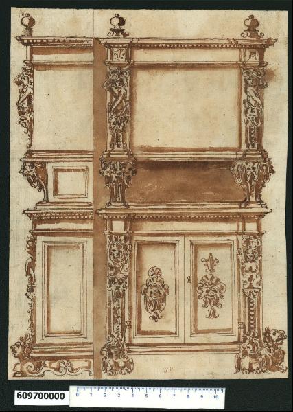 - NOTIZIE STORICO CRITICHE Nell'"Indice de due Tomi d'Intagli Tempietti ed altro", relativo ai tomi V e VI e compilato dal collezionista Giacomo Sardini, il disegno viene iscritto nel paragrafo "Mobili da Casa" con la definizione "159 Cattedra".\nIl disegno non viene riconosciuto come di Giovanni Battista Montano da Anna Bedon (Pracchi 1992, 2a parte, p. 20) mentre viene a lui attribuito da Lynda Fairbairn (1998, p. 771). La grafia del disegno in effetti si discosta alquanto dagli elaborati attribuiti a Montano, è più probabile quindi che sia stato eseguito da un allievo della sua bottega.\nLa Fairbairn lo individua come credenza, tipologia alla quale associa altri disegni della Collezione Sardini Martinelli (invv. 5,2; 5,45; 6,51; 6,89; 6,112; 6,121), cui aggiunge Roma, BAV, Ottoboniana lat. 3110 (fol. 25). Alcuni di questi fogli in realtà, non mostrano credenze, ma armadi o banchi. Il disegno oggetto della presente scheda potrebbe essere assimilato a quello presente nella collezione milanese, inv. 6,122.\nIl foglio raffigura l'alzato frontale e laterale di una credenza articolata su tre registri che mostrano soluzioni decorative differenti. Nel registro inferiore, a sinistra, su un piede con testa femminile si eleva una lesena con elementi floreali e testa alata di cherubino; a destra la testa femminile riproposta anche sulla lesena e quella che funge da piede è affiancata da un leone. Anche le ante presentano decorazioni diverse. Il registro inferiore è separato da quello superiore da un vano aperto, delimitato da mensole con mascheroni. Il contenitore superiore è chiuso (ma non presenta il disegno degli sportelli) e delimitato da lesene con mascherone (a sinistra), testa di cherubino (a destra) e figura femminile.