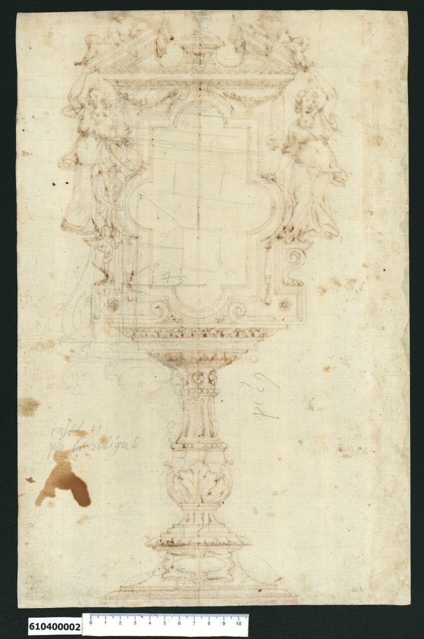 - NOTIZIE STORICO CRITICHE Nell'"Indice de due Tomi d'Intagli Tempietti ed altro", relativo ai tomi V e VI e compilato dal collezionista Giacomo Sardini, il disegno viene iscritto, insieme ad altri contigui, nel paragrafo "Reliquario" alla numerazione "164" e "163.164".\nSul verso del foglio è uno schizzo appena abbozzato a grafite che costituisce forse un primo pensiero per un reliquiario.