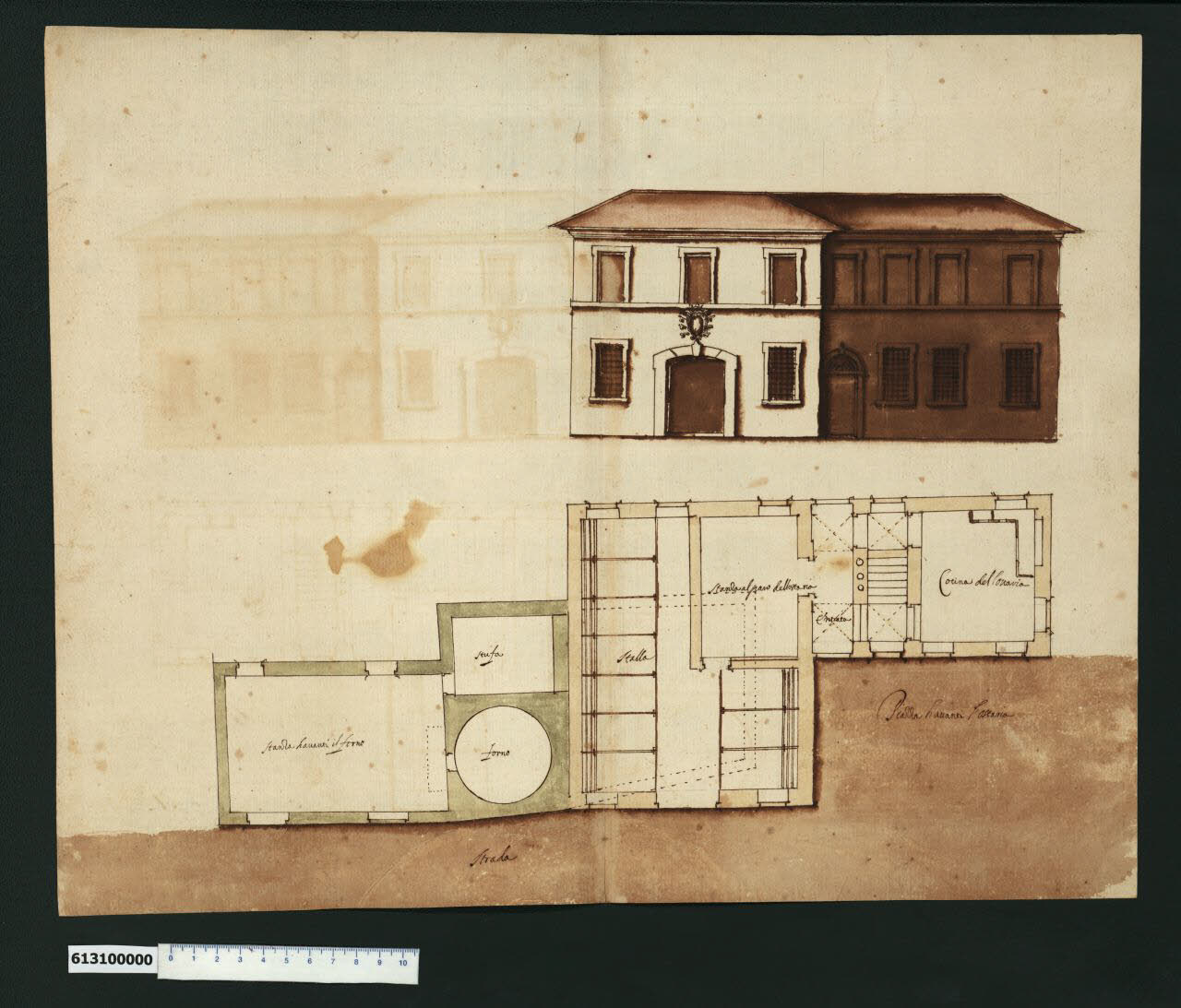 - NOTIZIE STORICO CRITICHE Il foglio, con n. antico 180 (sul verso) e non citato in indice da Giacomo Sardini, riporta il disegno in pianta e in prospetto di un'osteria. Si tratta probabilmente di un progetto di nuova costruzione accanto a un edificio esistente, fronteggianti una strada e una piazza evidenziati con acquerello colore marrone. La planimetria evidenzia infatti da un lato un ambiente (forse un negozio di panetteria), le cui murature sono campite con acquerello di colore verde, costituito da un ampio locale con un forno e un locale più piccolo per la stufa. A lato al posto di un locale dai muri tratteggiati probabilmente demoliti, si sviluppa la pianta del piano terreno dell'edificio la cui fronte è rappresentata in corrispondenza nella parte superiore del foglio. L'edificio ha una forma ad L e la parte adiacente ai locali esistenti è occupata dalle stalle e da una stanza cui si accede sia dalle stalle sia dall'entrata laterale passante in prossimità del corpo scala che porta alla cucina sulla destra, di poco rialzata e ai locali superiori. Il prospetto è molto semplice, con finestre contornate e dotate di inferriate al piano inferiore. Il portone di ingresso alla stalla, pure contornato, è leggermente arcuato con chiave di volta, sovrastata da una cartella che rappresenta probabilmente l'insegna dell'osteria. L'ingresso pedonale è invece arcuato con sopraporta. \nNon vi sono elementi sufficienti per stabilire l'autore, né la localizzazione dell'edificio.