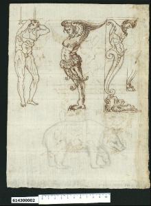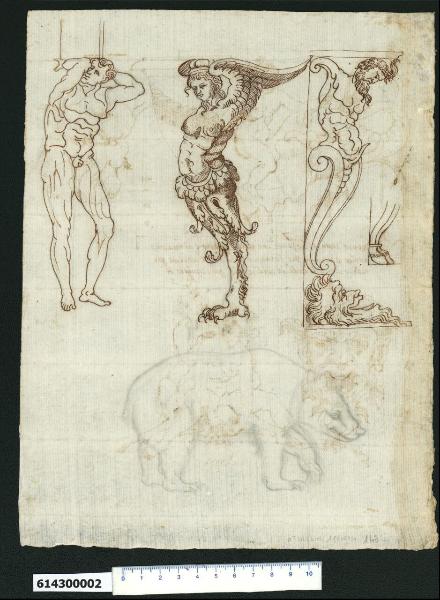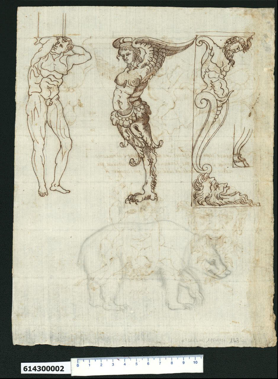- NOTIZIE STORICO CRITICHE Nell'"Indice de due Tomi d'Intagli Tempietti ed altro", relativo ai tomi V e VI e compilato dal collezionista Giacomo Sardini, il disegno viene iscritto nel paragrafo "Mobili da Casa" con la definizione "186 altre d.e" [si legga: mensole].\nIl disegno è dello stesso autore che ha realizzato quelli tratteggiati sul recto del foglio e forse altri due disegni presenti nel sesto tomo della Collezione (Milano, Collezione Sardini Martinelli invv. 6,143 R; 6,133R e 6,133 V). In questo caso sono raffigurati degli esempi di telamoni, ossia supporti a guisa di mensole dalle fattezze umane o mitologiche.\nIl primo esempio è un uomo molto muscoloso e possente che potrebbe rappresentare Ercole, che sostiene col capo e le braccia rialzate un elemento architettonico rettangolare non definito.\nSulla destra è una figura femminile alata il cui corpo, pure muscoloso, si trasforma in un motivo vegetale da cui esce una zampa di rapace (o leonina?) che costituisce l'appoggio. La figura, che ha l'ala rialzata sicuramente in funzione di sostegno insieme alla testa ornata da un copricapo, raffigura un'arpia ossia un altro personaggio mitologico. \nAnche la terza figura più a destra ha sembianze mostruose secondo il gusto del periodo e si presenta con il busto di un uomo barbuto con le braccia ridotte a moncherini a voluta e il corpo possente e incurvato inserito e risolto in due volute allungate che si uniscono alla base in un unico ricciolo, poggiante su un mascherone di vecchio barbuto dalla bocca aperta, disteso alla base e raffigurato di profilo.\nLa figura, che ha la funzione di mensola di supporto con la testa e i corti moncherini a voluta, rappresenta il dio Pan, come lascia supporre lo schizzo a lato di zampe caprine che probabilmente costituivano una variante alla soluzione di appoggio alla base adottata.\nNella parte inferiore del foglio è disegnata a matita la sagoma di un orso, che rafforzerebbe l'ipotesi che questi studi fossero in relazione coi giardini di Bomarzo, proprietà della famiglia Orsini.