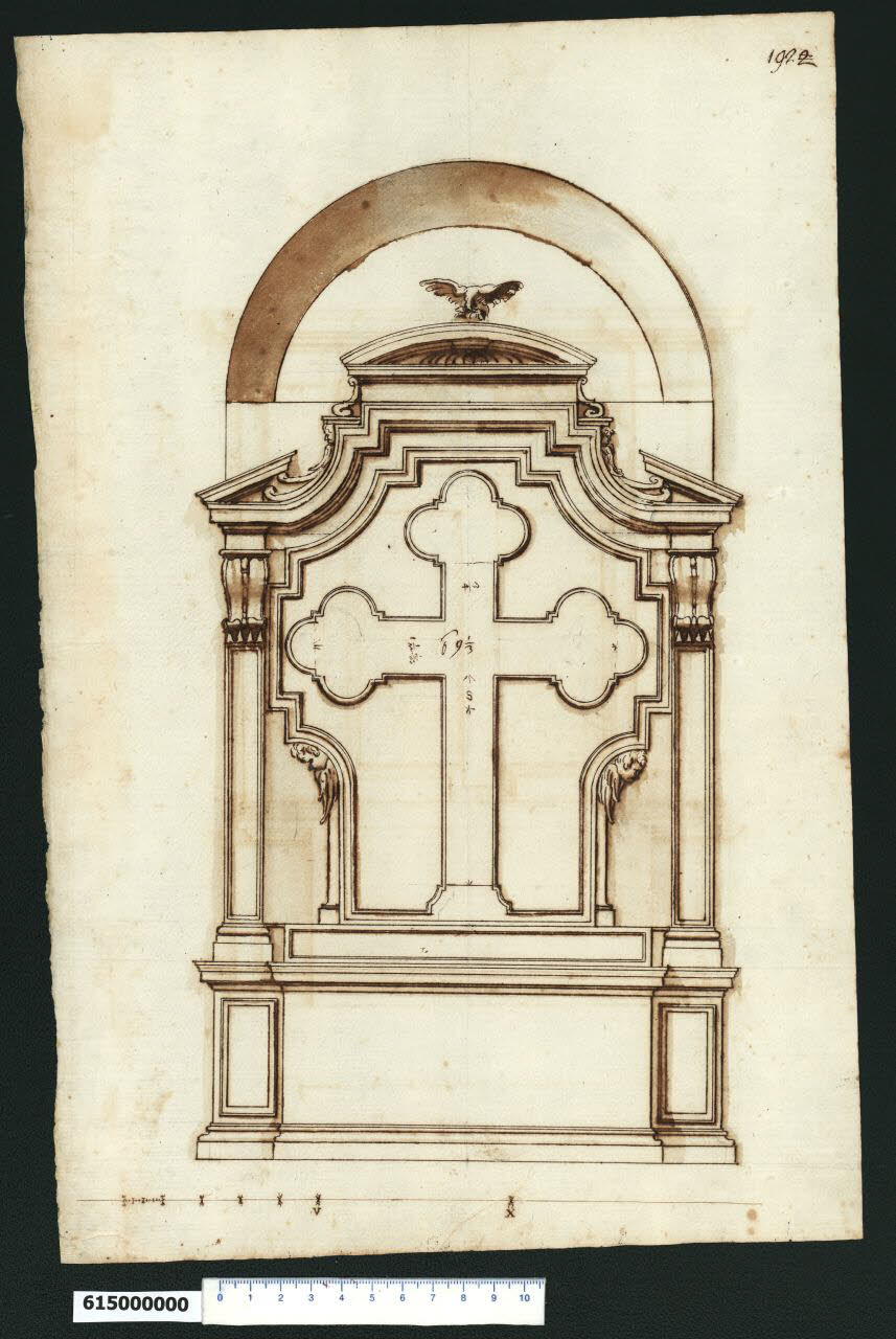 - NOTIZIE STORICO CRITICHE Nell'"Indice de due Tomi d'Intagli Tempietti ed altro", relativo ai tomi V e VI e compilato dal collezionista Giacomo Sardini, il disegno viene iscritto, insieme ad un altro contiguo, nel paragrafo "altari diversi" con la definizione "190. 192. per croci".\nL'altare raffigurato sul foglio appare applicato a una parete che tampona una nicchia arcuata. La finitura del disegno, che presenta poche ombreggiature, non consente di determinare appieno il rilievo degli elementi architettonici. \nSopra l'altare, semplicemente affiancato da due basi arretrate riquadrate e rifinito con una bassa zoccolatura sagomata e un piano con cornice leggermente aggettante, si eleva sullo sfondo della campitura centrale una grande croce trilobata. Questa sembra sorgere dalla base della doppia cornice sagomata che la circonda e che, con l'andamento alternativamente concavo e rettilineo, ne esalta la forma, in sinergia con la composizione architettonica superiore. Quest'ultima, partendo dalle basi laterali dell'altare con due lesene riquadrate decorate da volute su dentelli, presenta una cornice più rilevata che riprende l'andamento della cornice interna e si conclude ai lati con un accenno di frontone interrotto e nella parte superiore con un frontone curvilineo sormontato un pellicano che nutre con il proprio sangue i suoi piccoli, simbolo del sacrificio di Cristo.\nTestine di cherubino e piccole volute costituiscono insieme elementi di raccordo, di sostegno e di decoro per la composizione.\nIl disegno presenta misure interne alla croce ed è accompagnato dalla scala metrica con numeri romani simile a quella del disegno di inv. 6,149 della Collezione in esame, in cui si ritrova il motivo della croce inscritta in una cornice sagomata e del disegno inv. 4,15, in cui l'altare presenta la medesima croce trilobata evidenziata dalla cornice sagomata, il frontone curvilineo superiore sovrastato dall'aquila che nutre i piccoli e i cherubini in forma di sostegni. I disegni potrebbero essere stati realizzati dallo stesso autore.