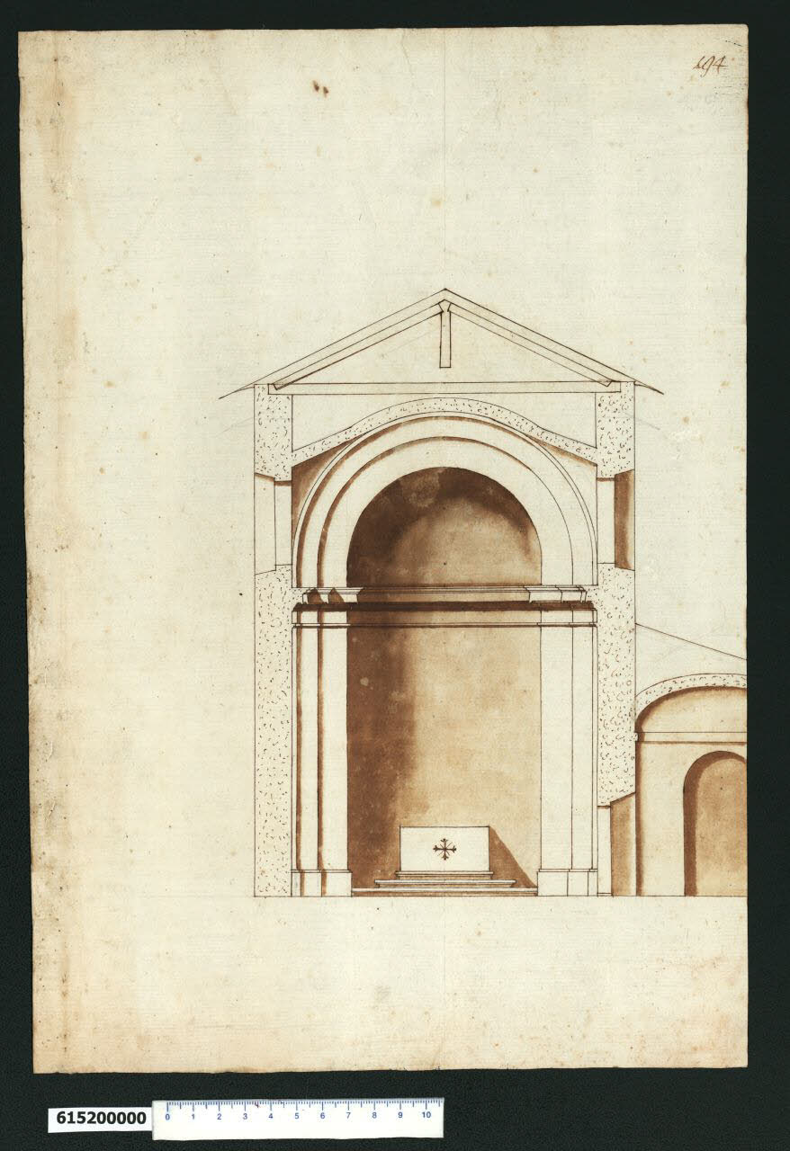 - NOTIZIE STORICO CRITICHE Nell'"Indice de due Tomi d'Intagli Tempietti ed altro", relativo ai tomi V e VI e compilato dal collezionista Giacomo Sardini, il disegno viene iscritto nel paragrafo "Chiese e loro parti" con la definizione "194 Tribuna".\nIl disegno interrotto a destra dal limite del foglio, riporta la sezione di un edificio, probabilmente una sorta di cappella, contenente un altare rialzato su tre gradini che presenta una croce raggiata al centro del frontale.\nLa cappella, i cui muri sezionati sono evidenziati da un puntinato ad inchiostro, ha un tetto con struttura a capriata lignea con monaco, nascosta da una volta appiattita all'interno, strombata in corrispondenza delle aperture laterali che garantiscono l'ingresso della luce all'interno. L'altare è posto sullo sfondo di una grande nicchia semicircolare coperta da un semicatino individuato da due arcate concentriche dai piani sfalsati e impostate su pilastri rastremati.\nQuesto ambiente si raggiunge da una porticina strombata che si affaccia sull'ambiente laterale, forse un atrio, che presenta una copertura a volta ribassata e una nicchia di fondo. Si possono riscontrare analogie stilistiche con il disegno di inv. 5,120 della Collezione in esame.