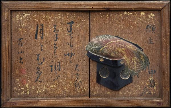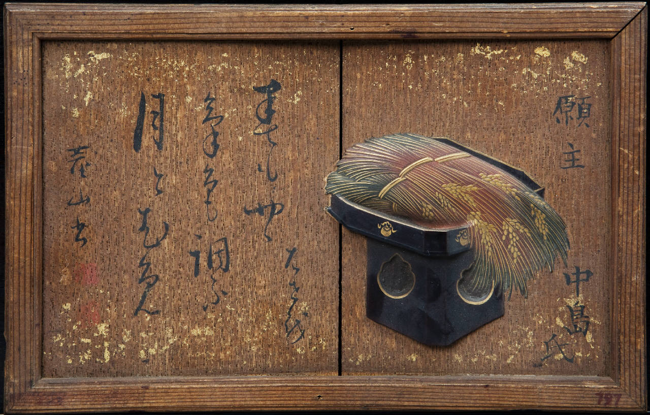 Tavoletta votiva in legno, racchiusa entro cornice. Sul lato destro della superficie a vista si vede una composizione con un basso tavolinetto sul quale si posano spighe (di riso?), realizzata in leggero rilievo e quindi laccata e parzialmente dorata. Sul resto della superficie iscrizioni di vario genere.