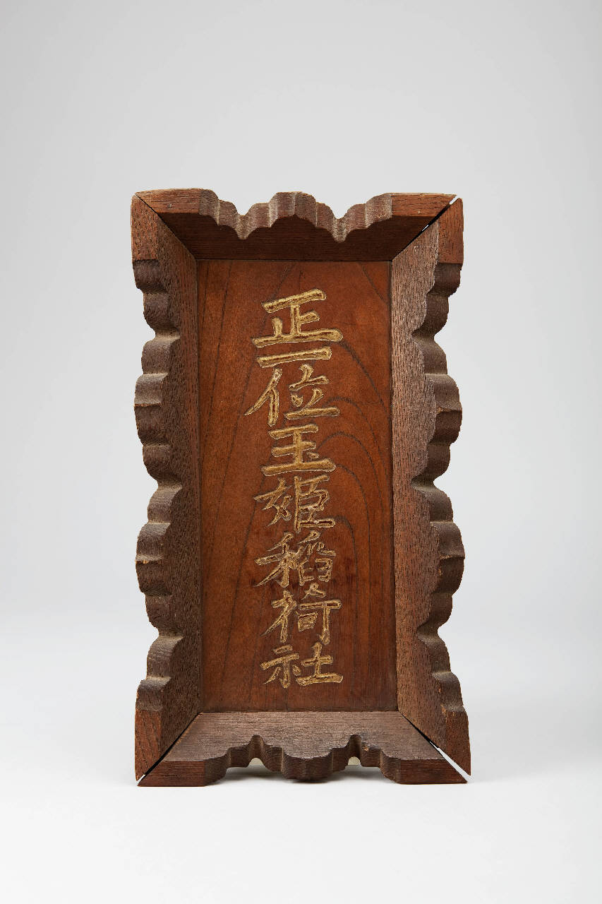 Tavoletta votiva (?) in legno di forma rettangolare racchiusa entro cornice dal profilo a ogive. All'interno iscrizione dorata in sette ideogrammi.