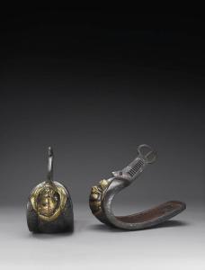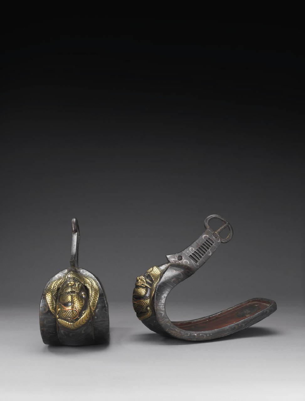 Coppia di staffe (abumi) in ferro con ageminatura in argento, applicazione di oro laminato e intarsio di altri metalli a formare un motivo in rilievo di drago. Interno laccato omogeneamente di rosso.