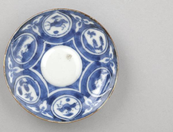Piattino circolare in porcellana dipinto in blu al di sotto dell'invetriatura trasparente. Sulla superficie a vista, tra fondo e tesa, si stagliano radialmente sei riserve a goccia, all'interno di ognuna delle quali è raffigurata una piccola scena, tra scorci di paesaggio, figure, animali, fiori e uccelli.