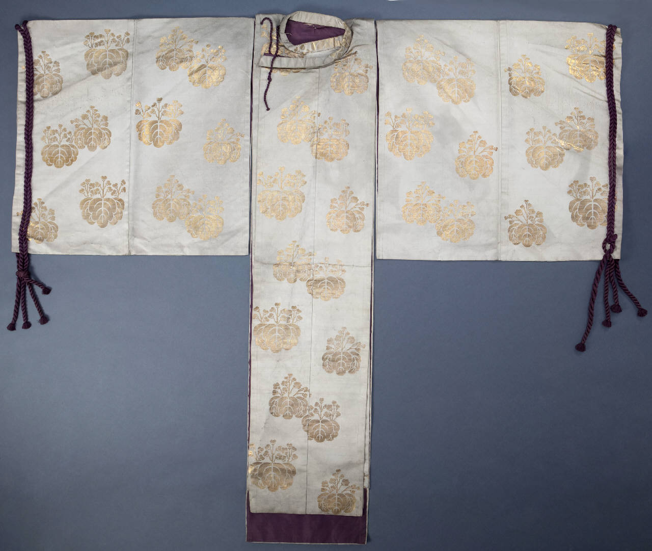 Abito da teatro di tipo kariginu in seta operata con trame supplementari in oro cartaceo, foderato di seta bianca lucida. Sull'esterno decoro di cespi di paulonia (kiri) a tre foglie e tre infiorescenze di tre-cinque-tre (gosan no kiri) disposti in modo sparso (chirashi moyo). Sulle maniche cordoni in seta viola (sprovvisto di cintura). Fodera colore viola.