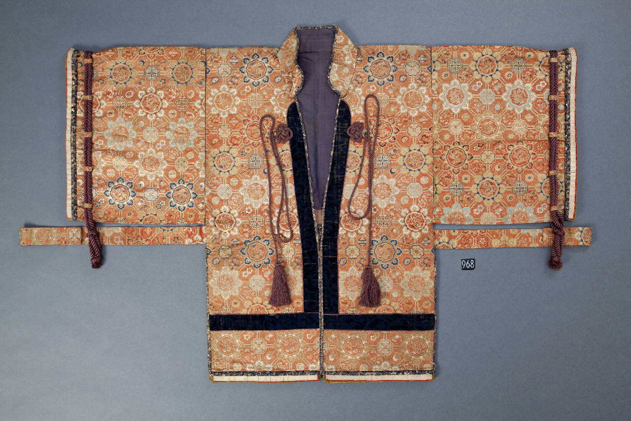 Variante shokko nikishi (spesso tradotta con lampasso). Tessuto in seta operato con disegni per trame supplementari in seta molto lucida e spessa con filati in oro. Fondo rosso aranciato, disegno in policromia e oro di maglie ottagonali ad incastro perfetto con fiori convenzionali, frontali e stilizzati, con otto petali carenti e lombati. Entro gli ottagonali "fiori cinesi" (karahana) stilizzati contenuti in cornici lobate. Delle linee (quattro) congiungono il karahana. Guarnizioni di velluto operato a tinta blu. Due nodi a pendagli in cordoncino di seta ad altezza maniche. Cintura fissata nella parte posteriore. Orli alle maniche e lembi inferiori percorsi da tripla decorazione di fettucce bianche, rosse e verdi. Fodera interna viola.