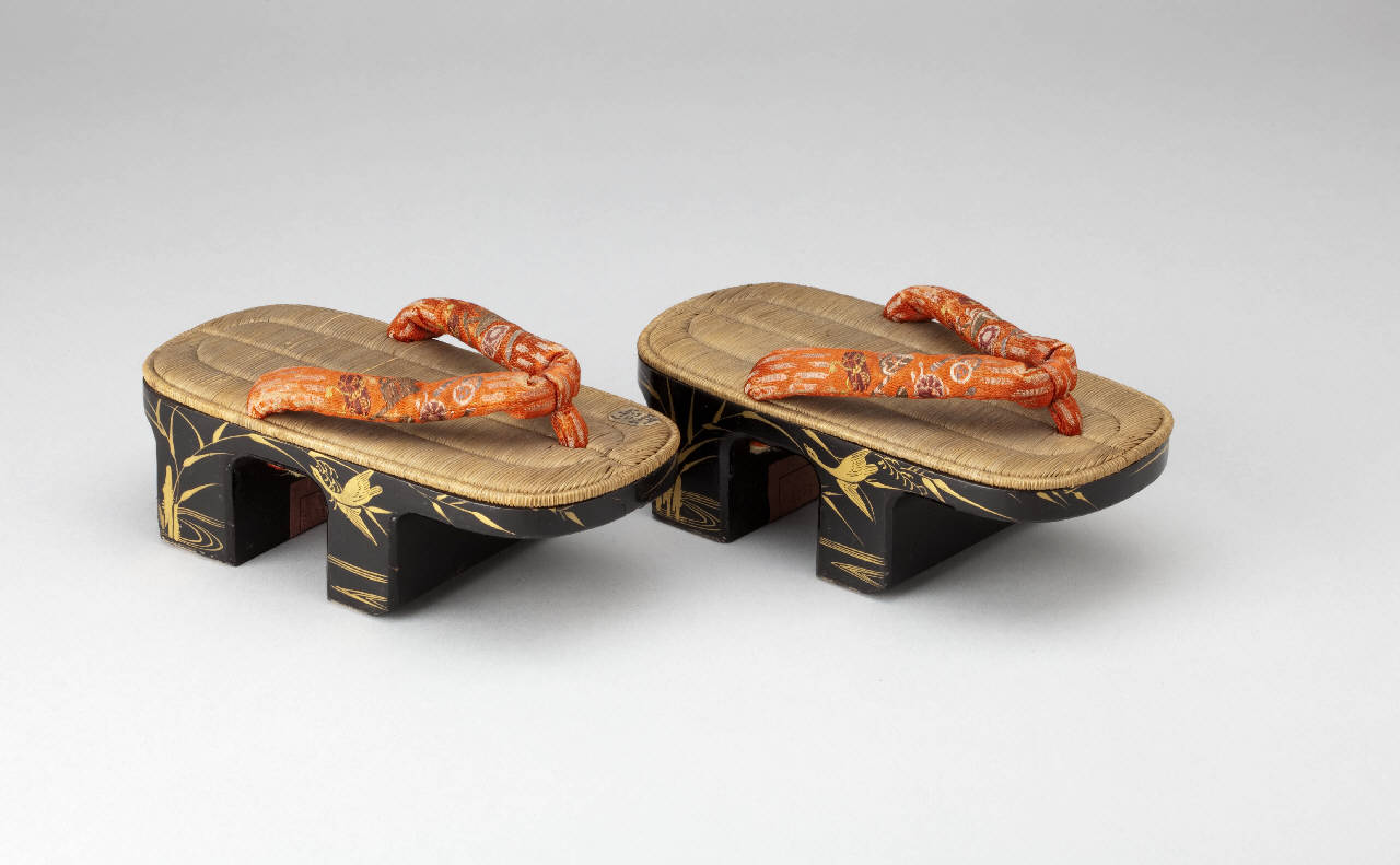 Paio di zoccoli (geta) in legno laccato di nero con motivo in oro di oca in volo sull'acqua; piano d'appoggio del piede in finissima paglia. Cordone infradito in seta e disagio in oro e filo policromo di motivo augurale (takara zukushi). Tacco a due listelli con campanellino (sotto, nel centro).