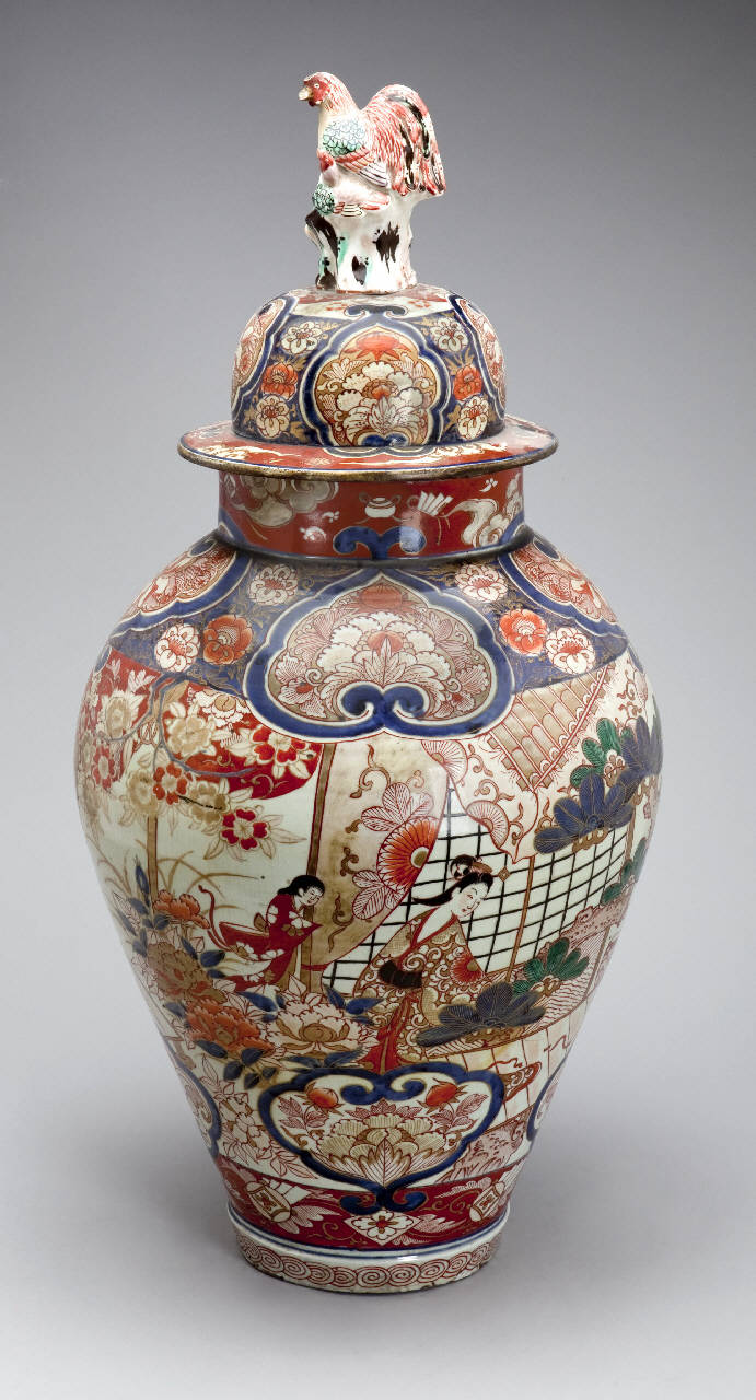 Vaso a sezione circolare con spalla bombata e coperchio a calotta emisferica. Decorazione dipinta in blu di cobalto sotto coperta, smalti rosso, nero e verde sopra coperta e diffusi tocchi di oro. Sul corpo si svolgono scene con dame in giardino tra piante di vario tipo e scorci di padiglione. Il coperchio è sormontato da presa a forma di gallo.