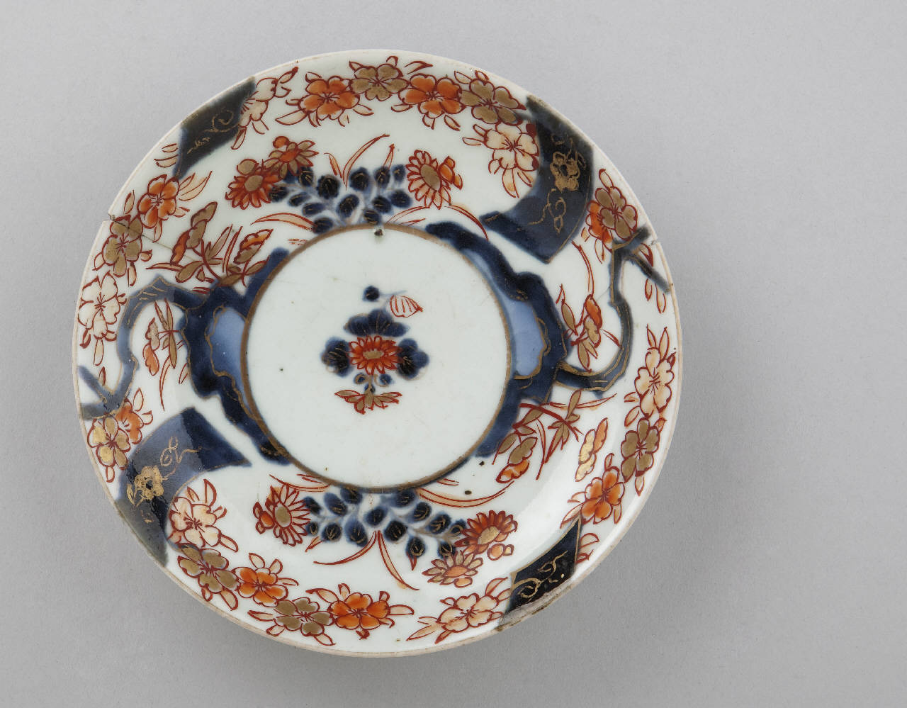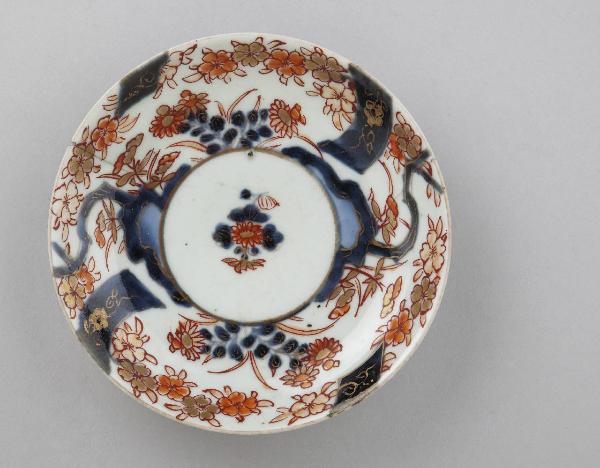 Piattino circolare. Decorazione dipinta in blu di cobalto sotto coperta, smalto rosso e oro sopra coperta trasparente. Sul fondo medaglione circolare con fiore al centro; intorno ricca decorazione floreale con rocce.