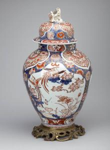 - NOTIZIE STORICO CRITICHE Esemplare di produzione delle fornaci di Arita tra la fine del Seicento e l'inizio del Settecento, di una tipologia destinata all'esportazione verso l'Occidente. La base in bronzo dorato con volute è di produzione europea, forse francese, del Settecento.