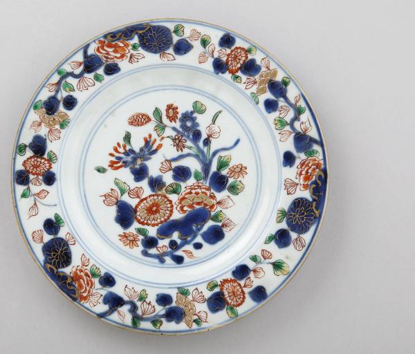 Piatto in porcellana di forma circolare. Decorazione floreale dipinta in blu di cobalto sotto l'invetriatura trasparente, smalto rosso e oro al di sopra della coperta.