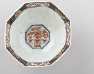 Scodella in porcellana a sezione ottagonale. Decorazione floreale dipinta in blu di cobalto sotto l'invetriatura trasparente, smalto rosso e oro al di sopra della coperta.