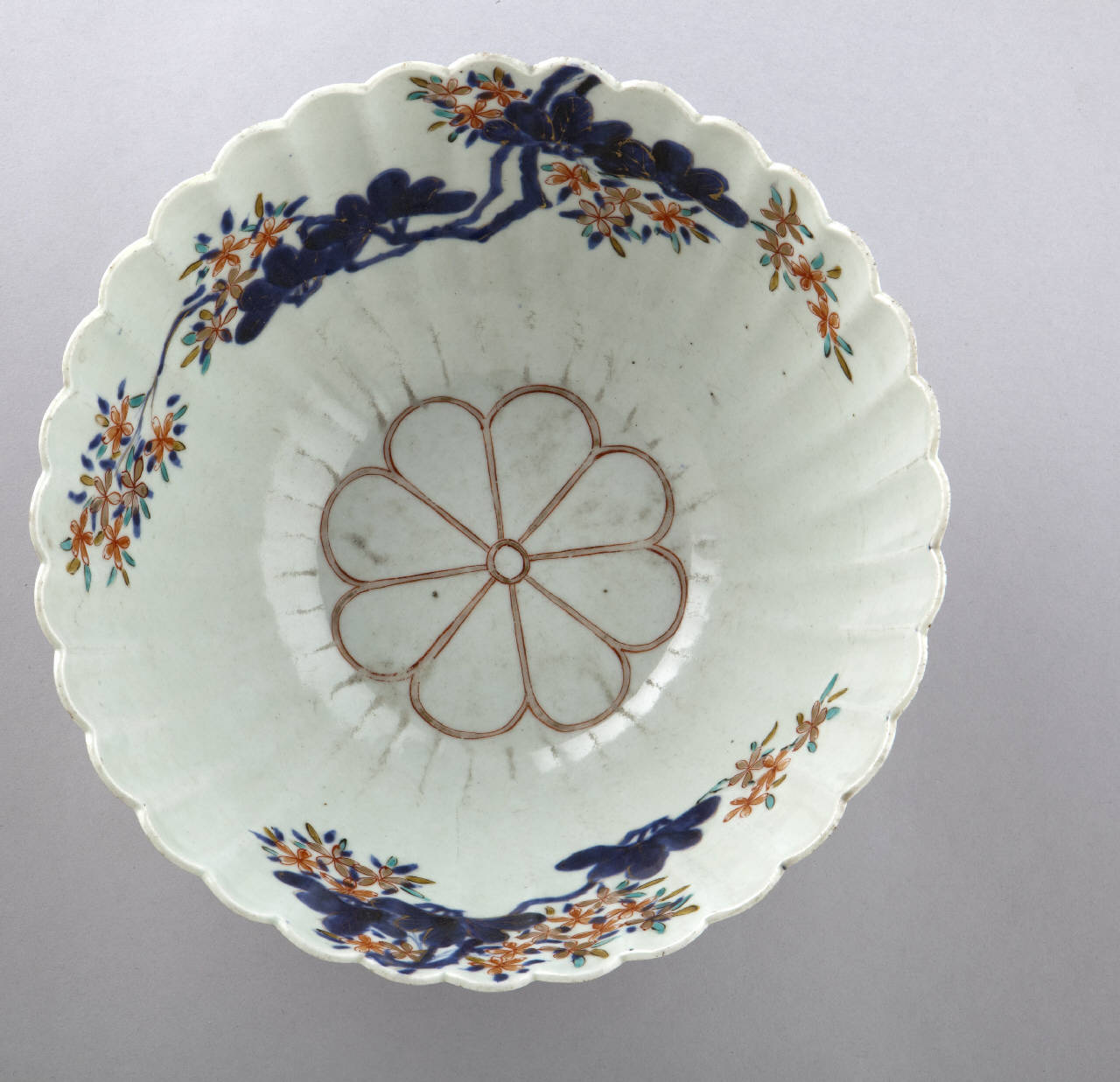 Ciotola in porcellana a sezione circolare con orlo e parete sagomati. Decorazione floreale dipinta in blu di cobalto sotto l'invetriatura trasparente, smalto rosso e oro al di sopra della coperta.
