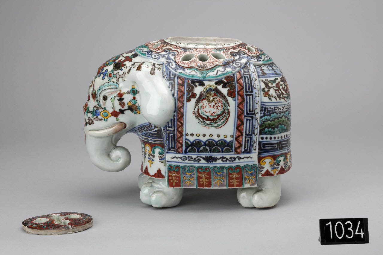 Portafiori in porcellana a forma di elefante. I fori per i gambi dei fiori si trovano sul dorso dell'animale, dov'è sito anche un piccolo coperchio anch'esso forato. La decorazione - dipinta a smalti policromi e radi tocchi di oro - consiste di ornati floreali, geometrici e di uccelli stilizzati.