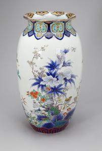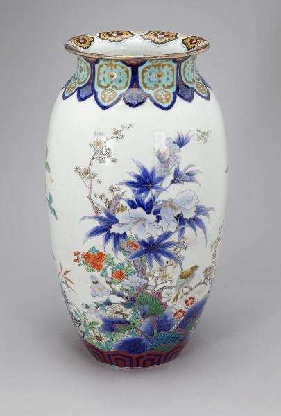 Vaso in porcellana a sezione circolare, con basso collo cilindrico e bocca espansa. La decorazione, dipinta a smalti policromi, consiste di una ricca composizione sul corpo, mentre verso la bocca e verso la base si dispongono pannellature.