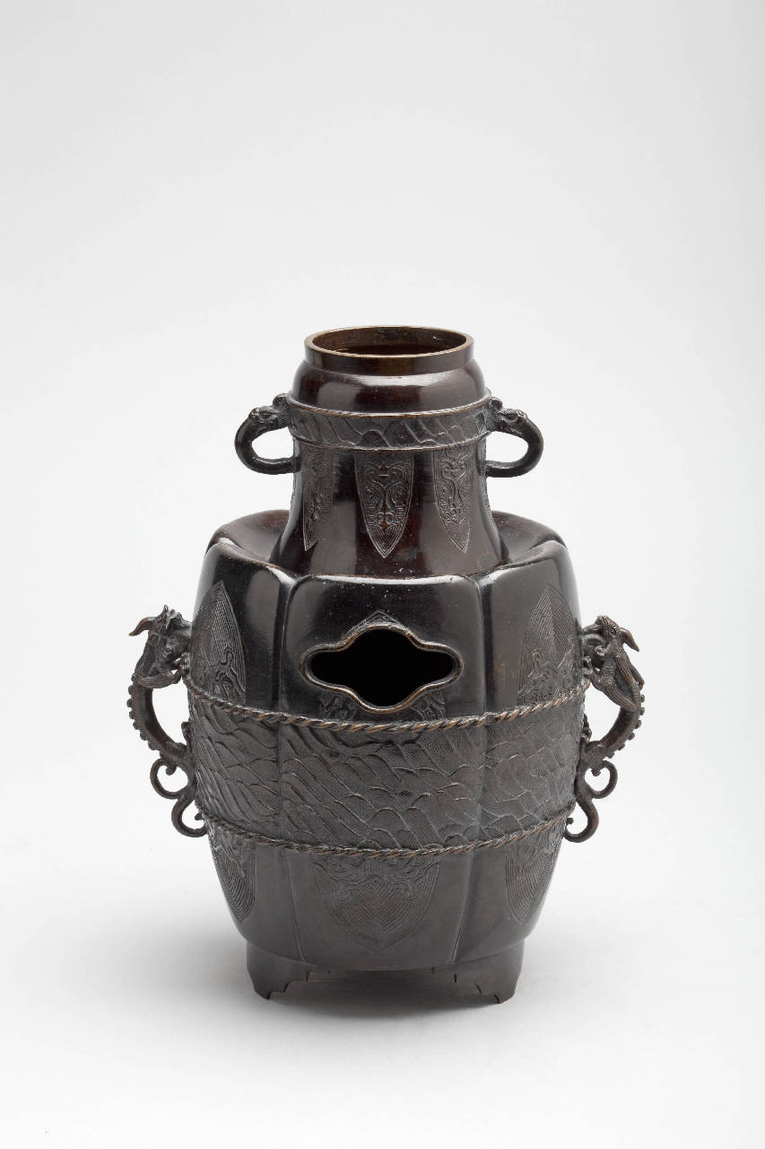 Vaso in bronzo a sezione circolare in due pezzi (corpo e collo). Sul corpo ha due manici a forma di drago (ryu), due finestre quadrilobate, una fascia con motivo di onde (nami) e pannelli lanceolati con ornati geometrici. Questi ultimi si trovano anche sul collo, dove sono anche due manici a testa di elefante.