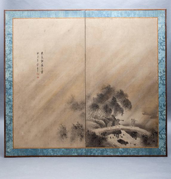Paravento pieghevole a due ante, con intelaiatura in legno e cornice in tessuto, entro la quale si svolge un paesaggio a inchiostro e colori tenui con tre figure che attraversano un ponte in basso a destra.