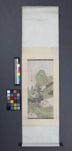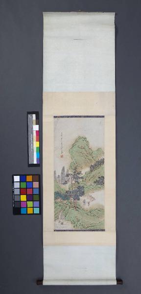 Dipinto verticale (kakemono) in carta dipinta in policromia raffigurante un paesaggio montano con due figure verso il basso.