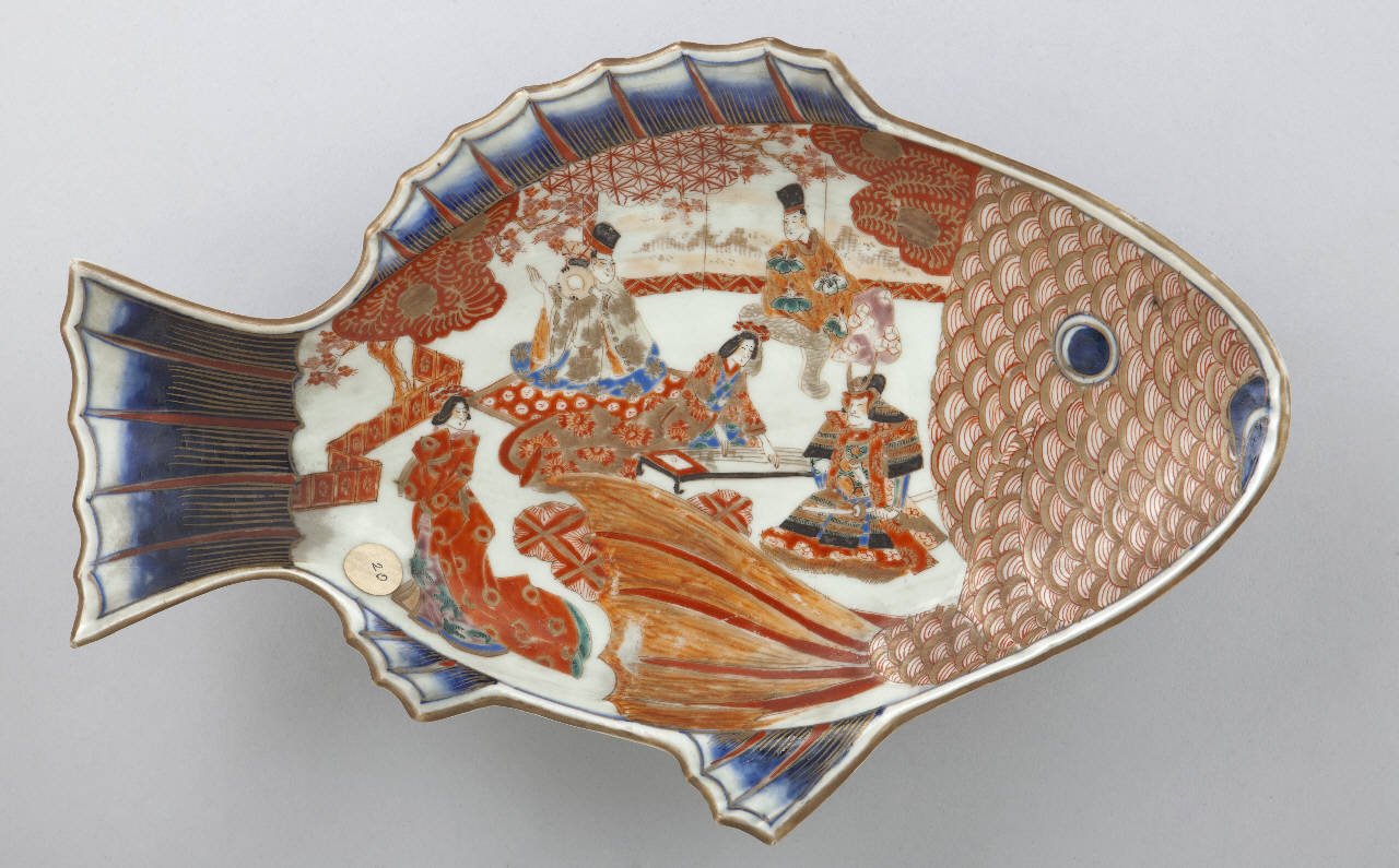 Piatto in porcellana dipinta, dorata e invetriata a forma di pesce. Sul fondo è raffigurata una composizione ambientata all'aperto con quattro samurai e una dama.