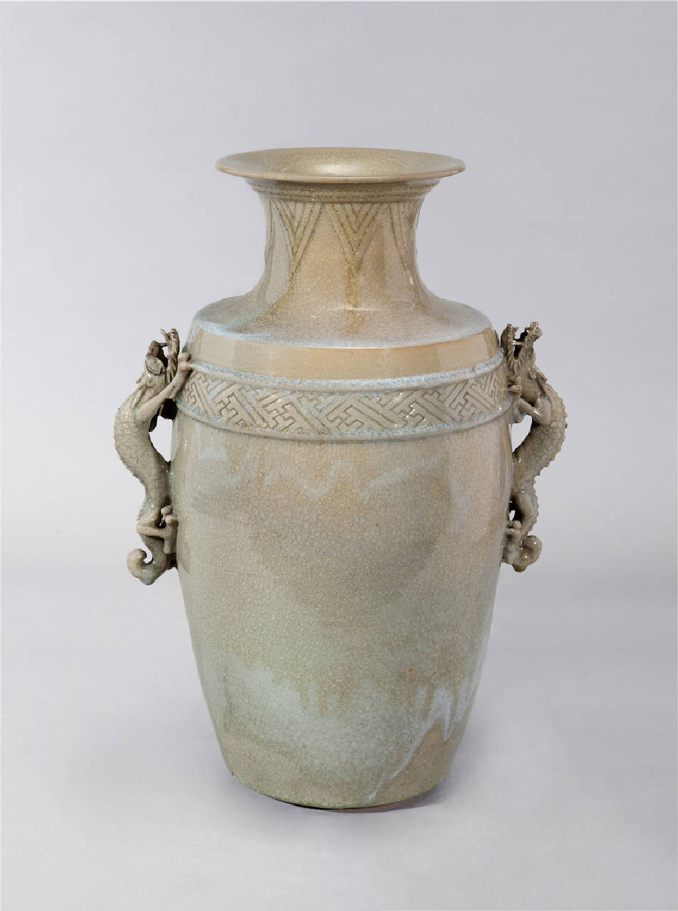 Vaso in ceramica rivestita di invetriatura di tipo céladon. Anse a forma di drago (ryu). sulla parte superiore banda con motivo geometrico a incisione. Verso la bocca pannellatura lanceolata.