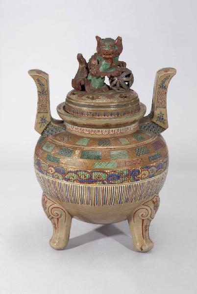 - NOTIZIE STORICO CRITICHE Forma derivata dal ding, contenitore cinese di epoca arcaica. Esempio di produzione di stile Satsuma di epoca Meiji (1868-1912), la sua datazione va collocata entro il 1890 per la sua storia collezionistica.\nIn mostra all'Esposizione Storica d'Arte Industriale (Milano 1874).