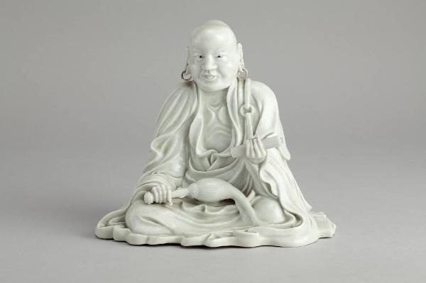 Statuetta in porcellana invetriata raffigurante un rakan seduto. Vestito solo di un'ampia tonaca che lascia scoperto parte del torso sul davanti, ha lobi delle orecchie allungati con orecchini ad anello, cranio rasato, nella mano sinistra tiene un rotolo e in quella destra uno scacciamosche, ed è accentuatamente smagrito. I dettagli della composizione sono realizzati a incisione e leggerissimo rilievo al di sotto dell'invetriatura.
