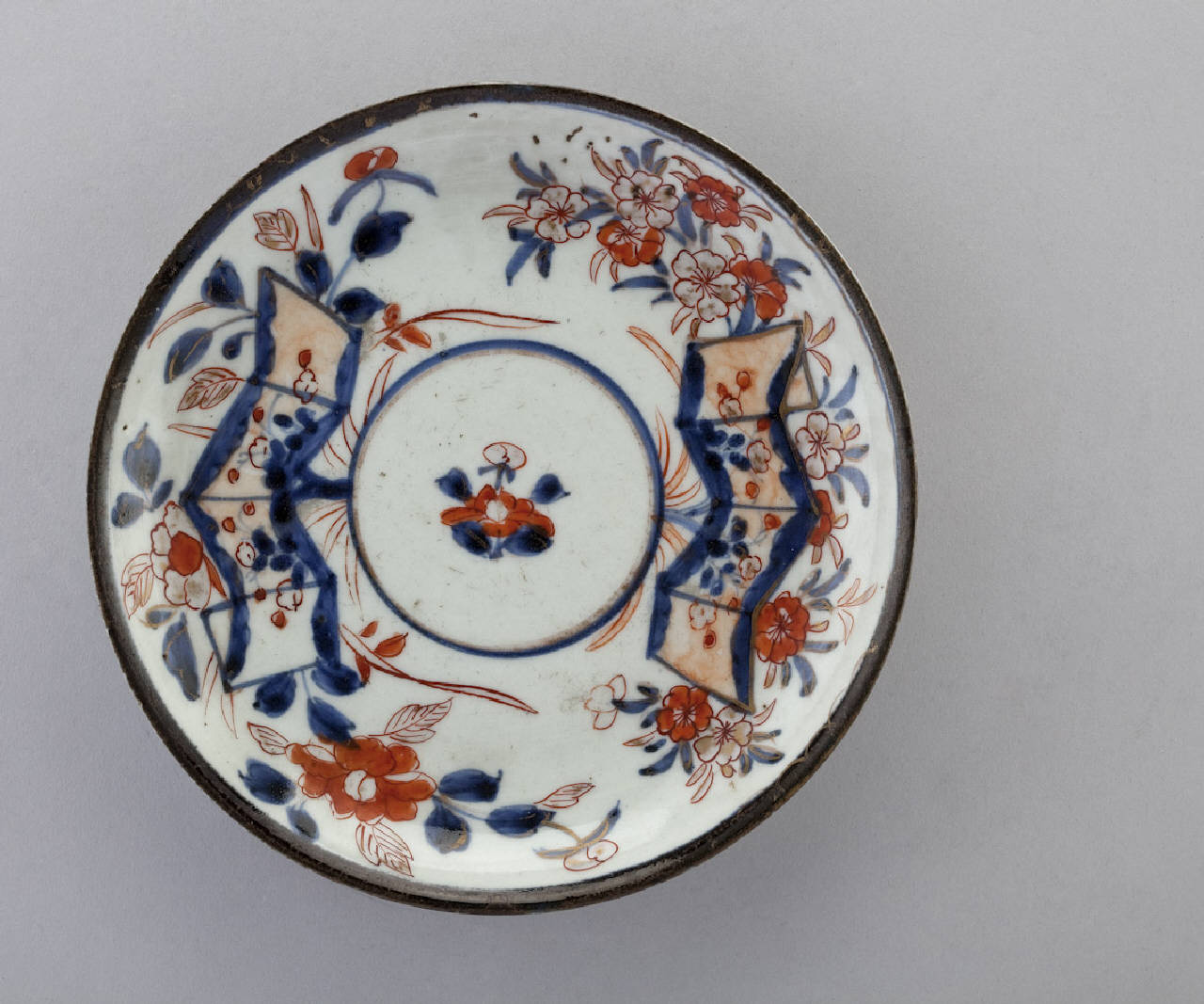 Piattino circolare in porcellana invetriata, smaltata e arricchita da tocchi d'oro. Sulla superficie a vista, decorazione floreale disposta intorno a medaglione circolare centrale.