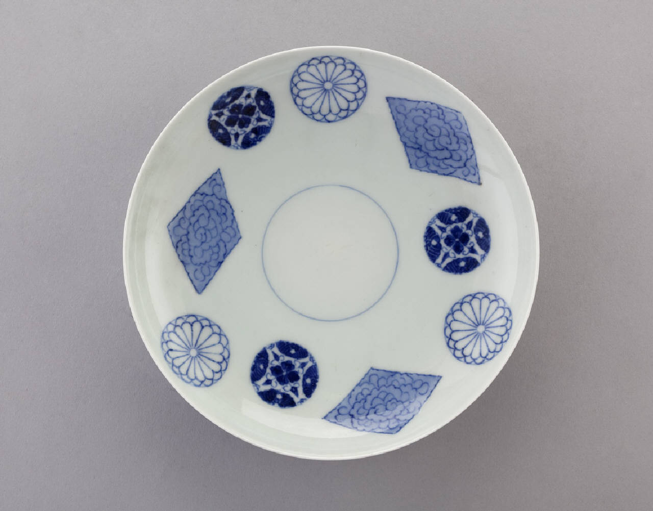 Piatto (sara) circolare in porcellana dipinta a smalto blu di cobalto sotto invetriatura trasparente. La decorazione mostra sulla superficie a vista una composizione geometrica, con medaglioni circolari e a losanga disposti prevalentemente all'interno della parete.