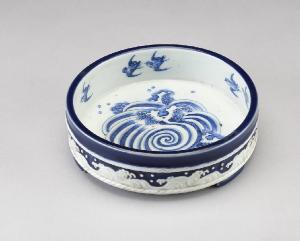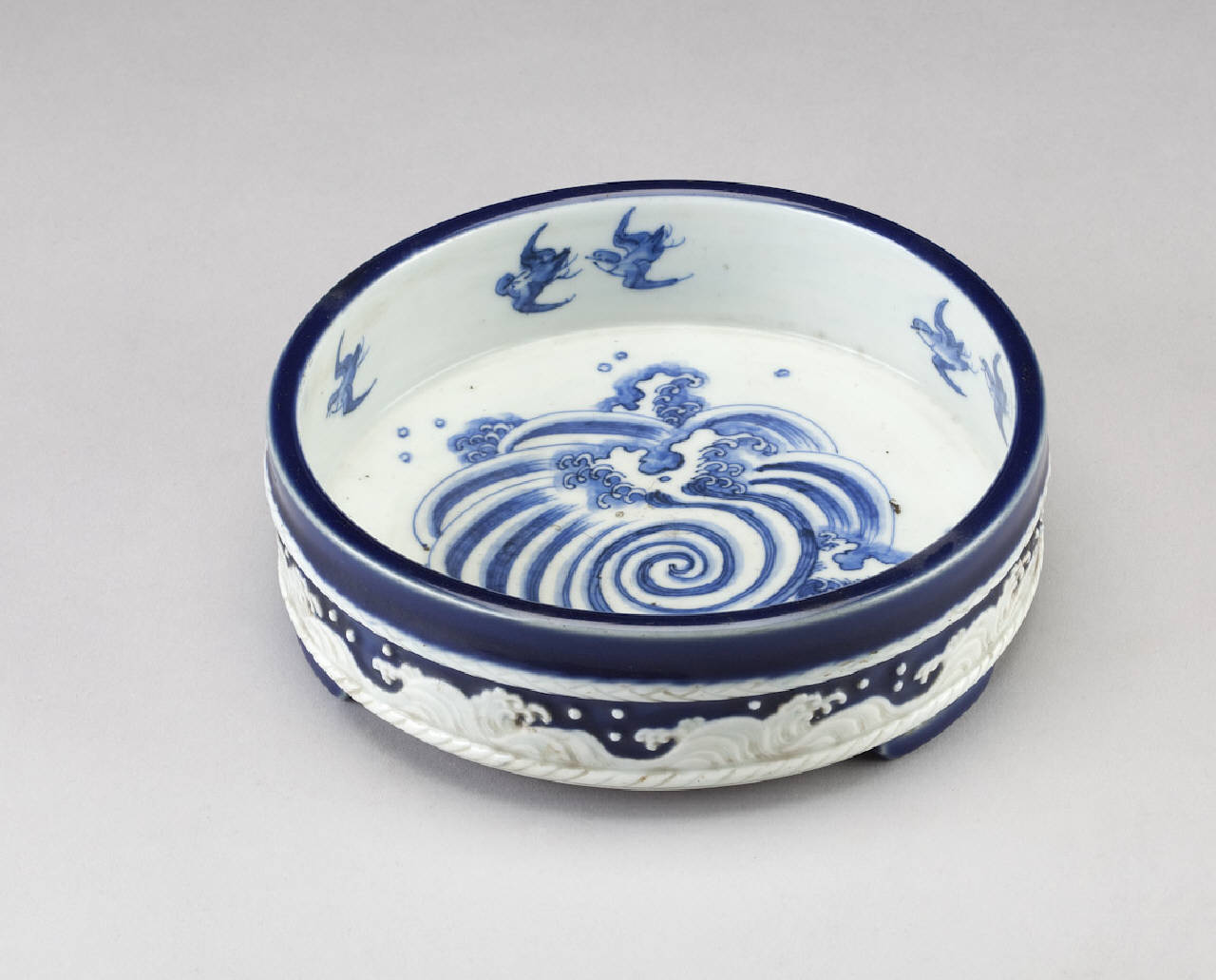Portavasi in porcellana dipinta a smalto blu. A sezione circolare, mostra sulla parete esterna un decoro in rilievo di onde. All'interno composizione con uccelli in volo sulle onde.