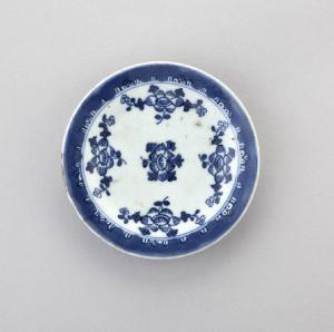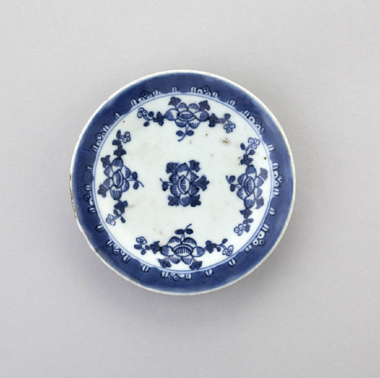 Piattino circolare in porcellana dipinta a smalto blu di cobalto sotto l'invetriatura trasparente, con decorazione floreale.