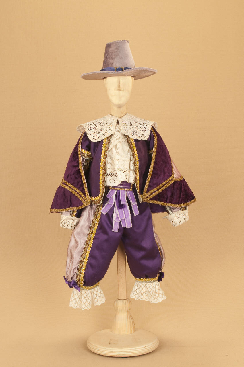 Costume da nobiluomo di foggia seicentesca composto da calzoni, casacca, pettorina, collo, cappa, cintura e cappello.