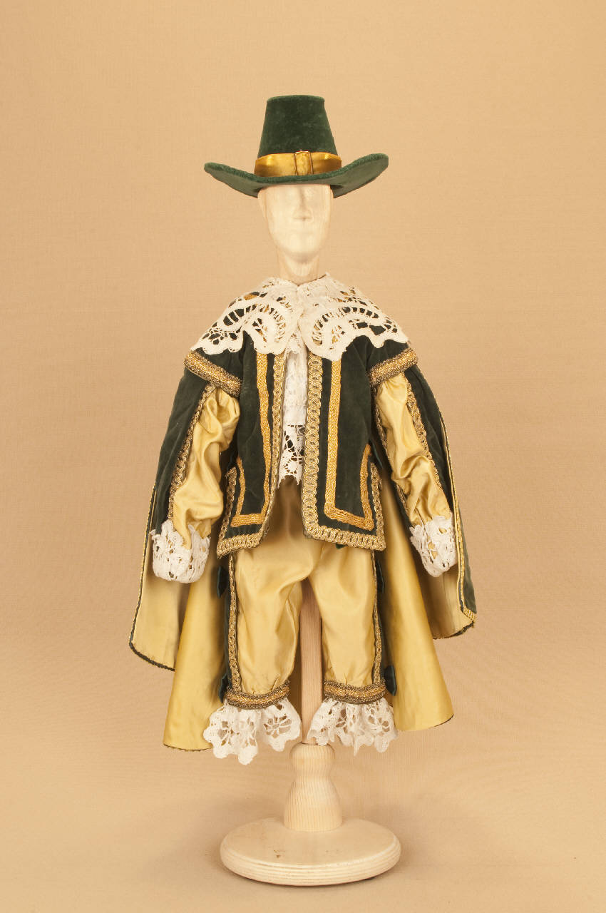 Costume da nobiluomo di foggia seicentesca composto da calzoni, casacca, pettorina, collo, mantello, cintura e cappello.