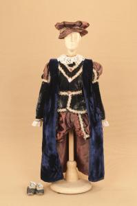 Costume da nobiluomo di foggia cinquecentesca composto da braghe, farsetto, cintura, sopravveste, scarpe e cappello.