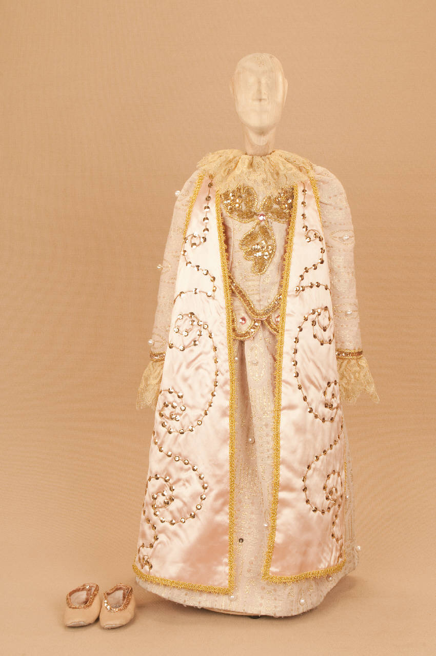 Costume da nobildonna di foggia cinquecentesca composto da gonna, corpino, sopravveste e scarpe.