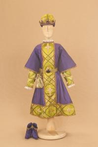 Costume da nobiluomo di foggia quattrocentesca composto da veste, scarpe, cintura (con borsetta) e cappello.