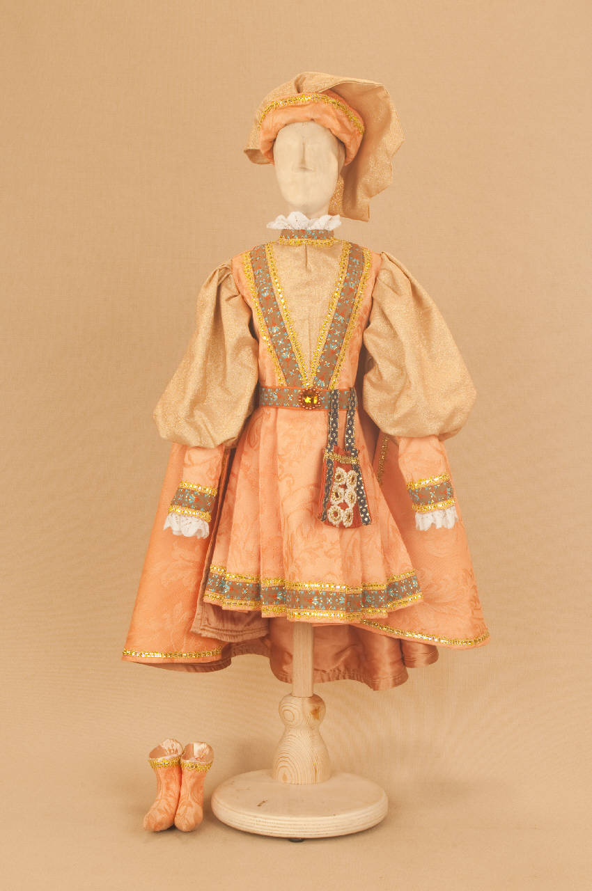 Costume da nobiluomo di foggia quattrocentesca composto da veste, scarpe, cintura (con borsetta), mantello e cappello.