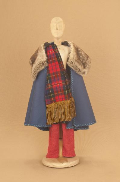Costume da uomo scozzese composto da calzabraghe, kilt, sciarpa e mantello.