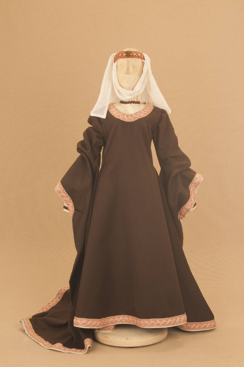 Costume da dama medievale composto da corpino, veste, soggolo, diadema e scarpe.