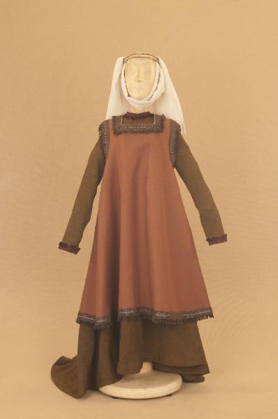 Costume da dama medievale composto da veste, sopravveste, soggolo, diadema e scarpe.
