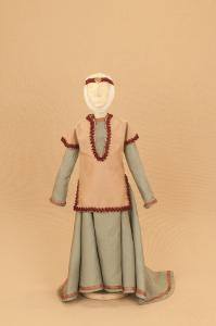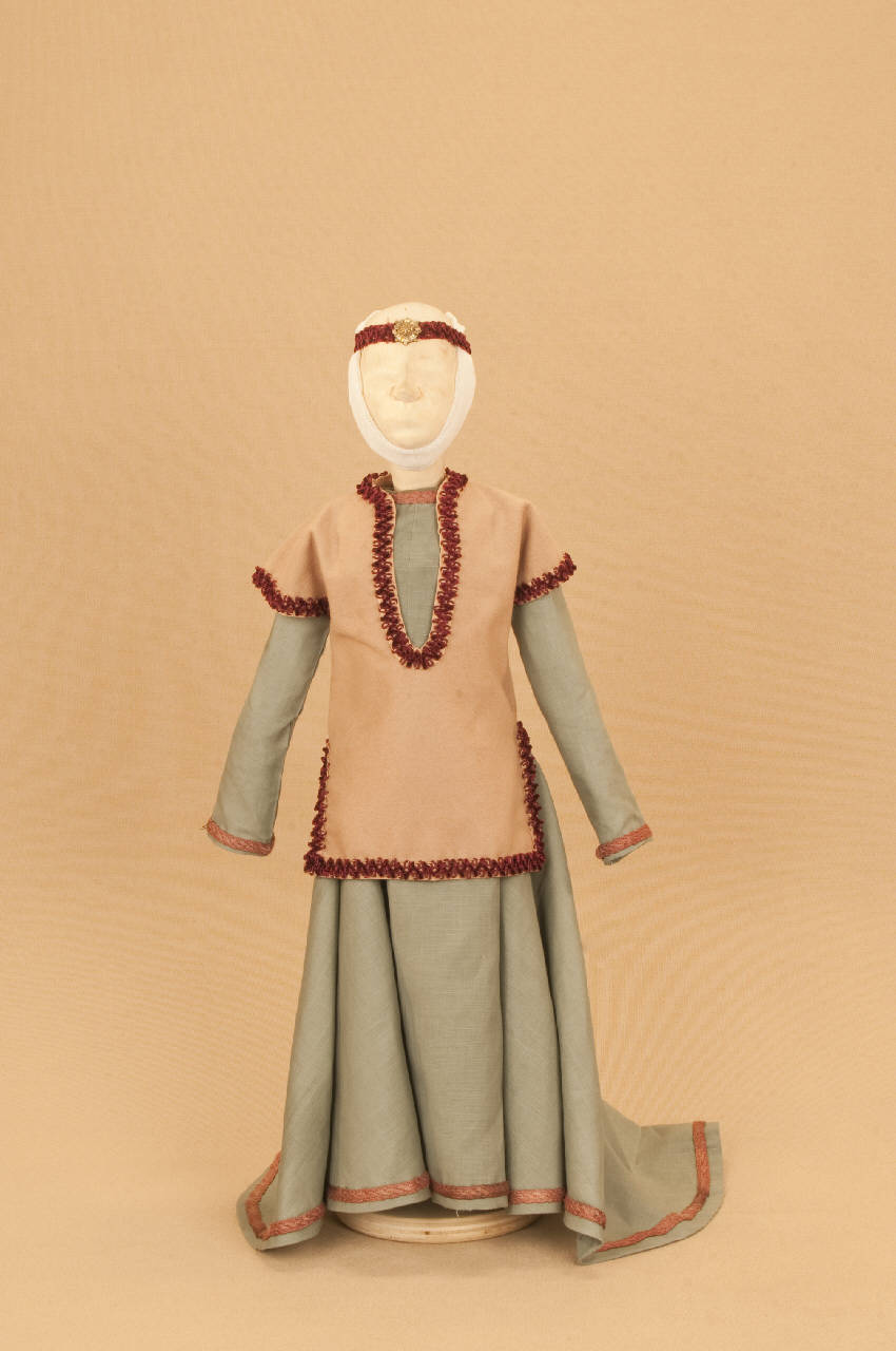 Costume da nobildonna medievale composto da veste, sopravveste, diadema e soggolo.