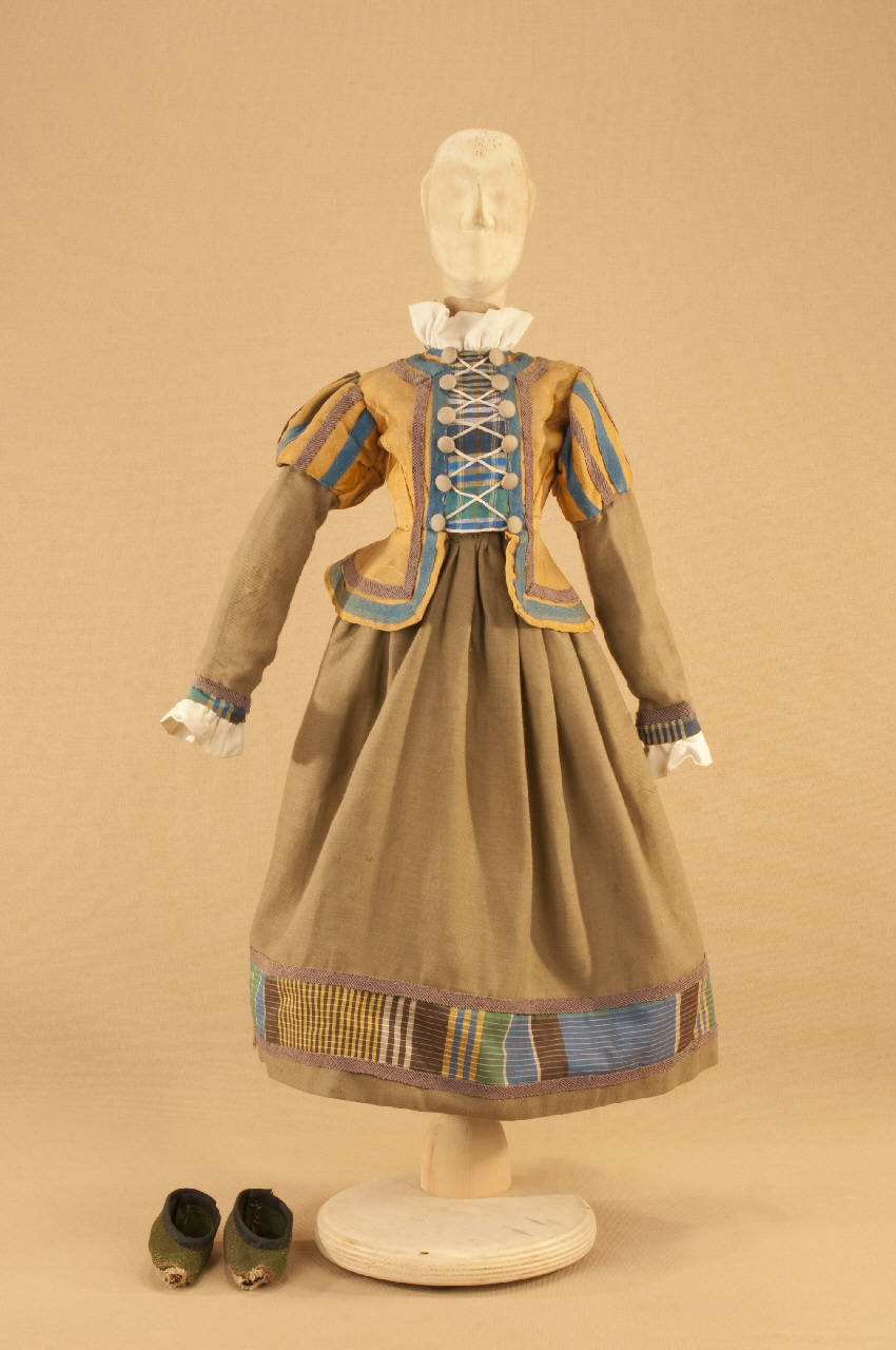 Costume da popolana di foggia seicentesca composto da gonna, corpino e scarpe.