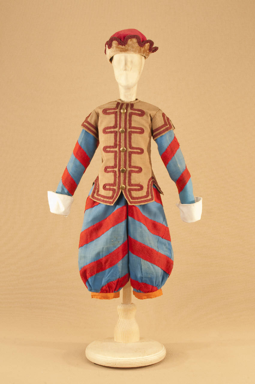 - NOTIZIE STORICO CRITICHE Il costume si completa con gorgiera, cintura in pelle e stivaletti. "Il gatto con gli stivali" è una fiaba con struttura di operetta messa in scena nel 1911 da Carlo II Colla per la Compagnia Carlo Colla e Figli. Il manoscritto proviene dalla Compagnia Lupi che agiva al Teatro Gianduia di Torino: lo attesta una dicitura riportata sul retro della copertina. L¿edizione marionettistica della Compagnia Carlo Colla presenta nella forma della féerie (parti recitate alternate alle parti cantate e alle parti musicate) la celebre fiaba di Charles Perrault. La messa in scena risente del gusto dell'epoca verista dell'operetta e ricalca con notevole perizia i temi della nostra tradizione popolare. La musica del maestro Felice Camesasca sottolinea lo spettacolo in modo sovente ironico e sorprendente; le scene sono dello scenografo Achille Lualdi (1869-anni ¿50).\nIntervengono inoltre nello spettacolo, intuizioni culturali come il richiamo al mondo degli animali di La Fontane nel gioco teatrale del capovolgimento fra animale ed essere umano.\n"Il gatto con gli stivali" è una delle prime fiabe ad entrare nel repertorio della Compagnia Carlo Colla e Figli.\nNegli anni ¿20 alcuni costumi vengono sostituiti con abiti realizzati da Caramba. Nel 1946 viene realizzato dalla casa di produzione "Saturnia" un cortometraggio, per la regia di Mario Baffico (1907-1972). Nel 1973, in occasione delle riprese televisive prodotte dalla RAI per la trasmissione "Marionette e Burattini" con la regia di Eugenio Giacobino al Teatro Litta, Eugenio Monti Colla provvede al restauro di numerosi costumi. Nel 1987, per il riallestimento dello spettacolo al Teatro Litta, nell'ambito della collaborazione con il "CRT Artificio" (1986-1994), vengono realizzati nuovi costumi, nuove marionette e nuovi materiali di attrezzeria.