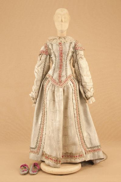 Costume da nobildonna di foggia tardo cinquecentasca composto da gonna, corpino e scarpe.
