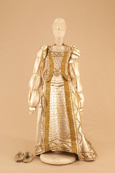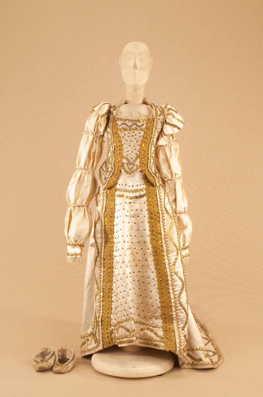 Costume da nobildonna di foggia tardo cinquecentasca composto da gonna, corpino e scarpe.