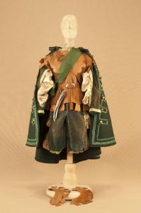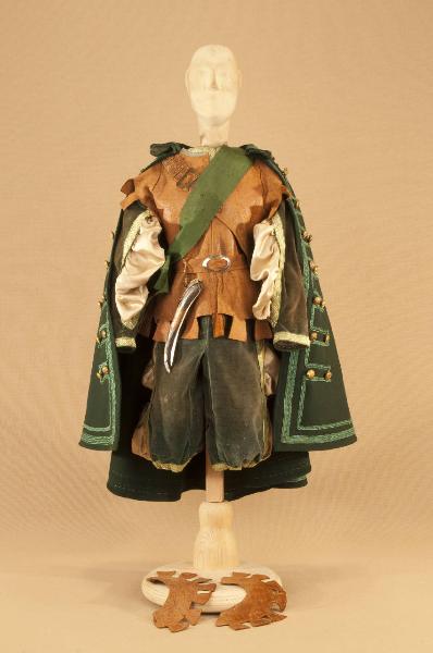 Costume da nobiluomo della caccia composto da calzoni, giacca, giustacuore, polsi, fascia, cintura con coltello, budriere e mantello.