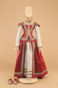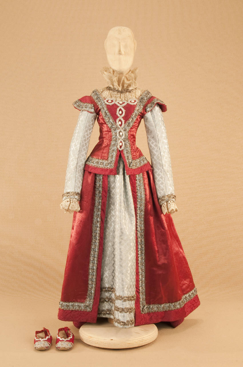 Costume da nobildonna di foggia tardo cinquecentasca composto da gonna, corpino e scarpe.